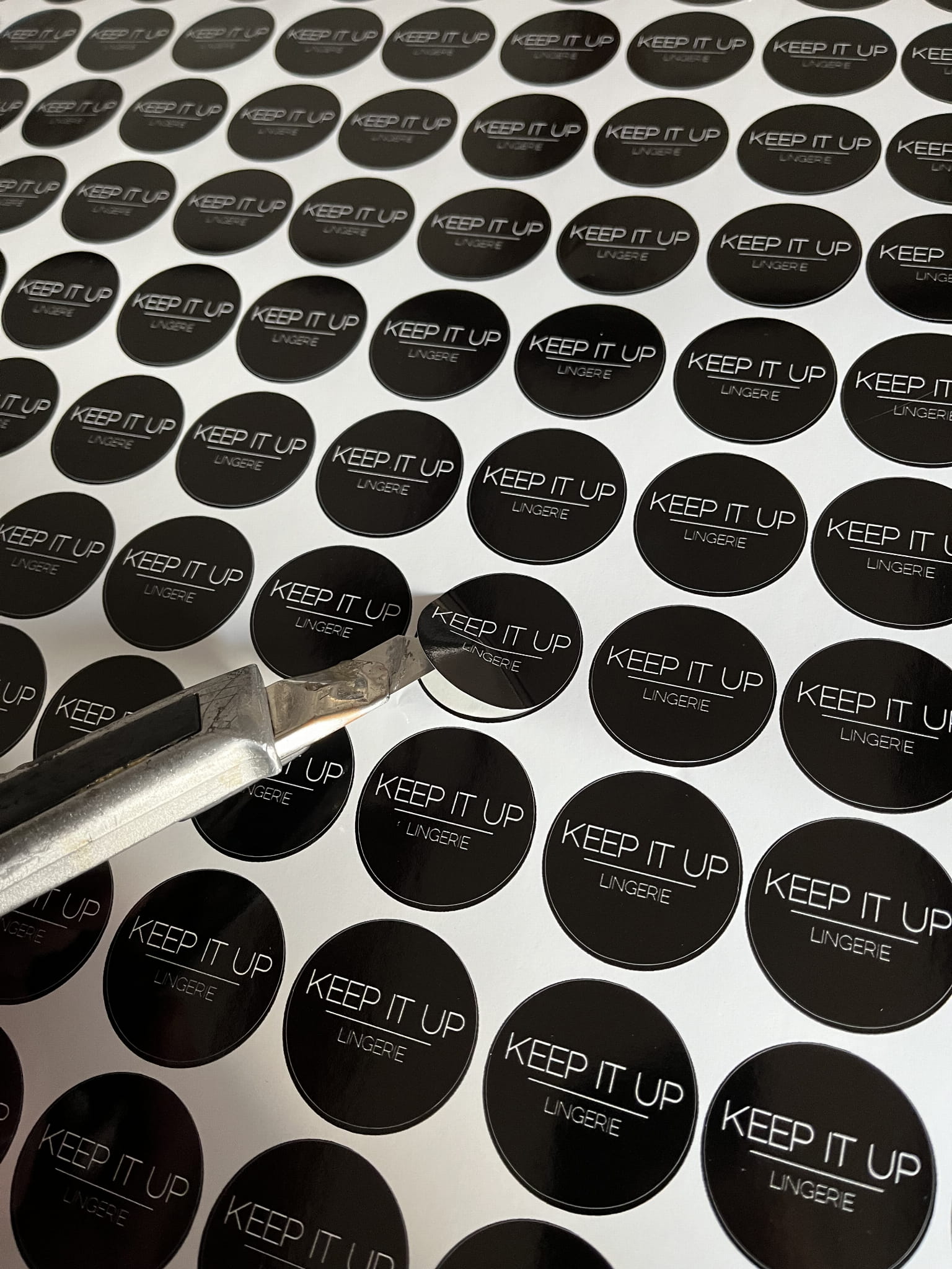 Wydruk oraz wycięcie zalaminowanych naklejek w dowolnym kształcie i ilości na powierzchni 1m2, FOLIA POLIMEROWA.
