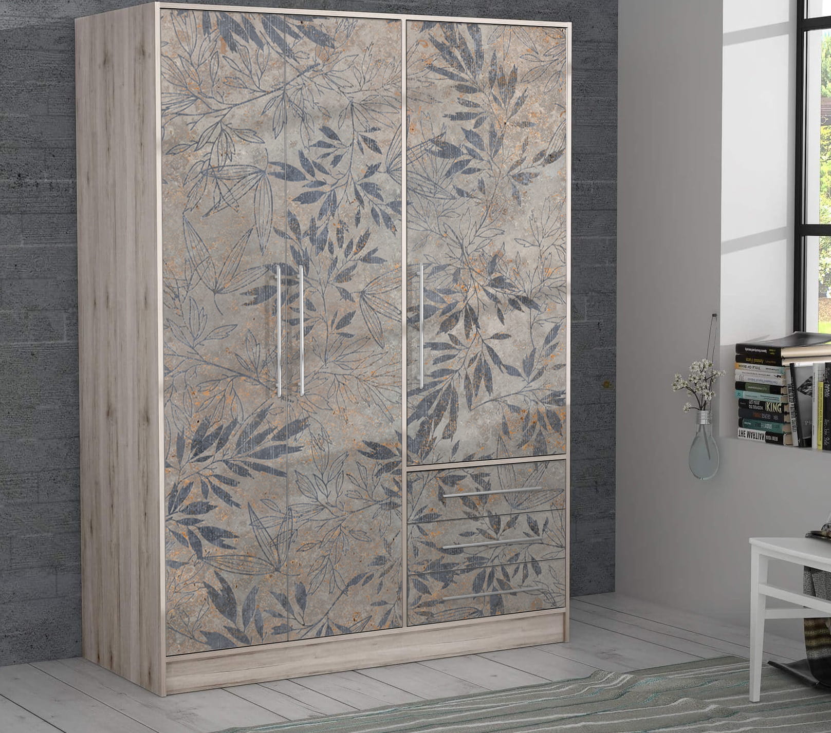 - na zdjęciu w galerii szafa ma wymiar 190cm wysokości i 150cm szerokości, w zależności od zamówionego wymiaru wzór będzie nieco inaczej skadrowany